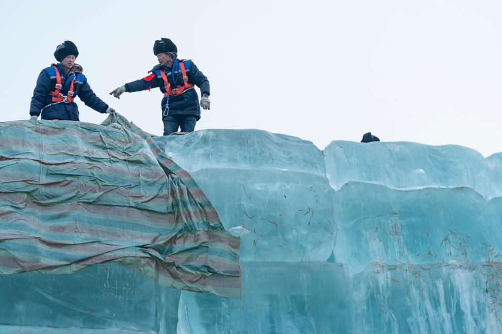 工作人员在拆除冰垛外层遮盖物。新华社记者 谢剑飞 摄