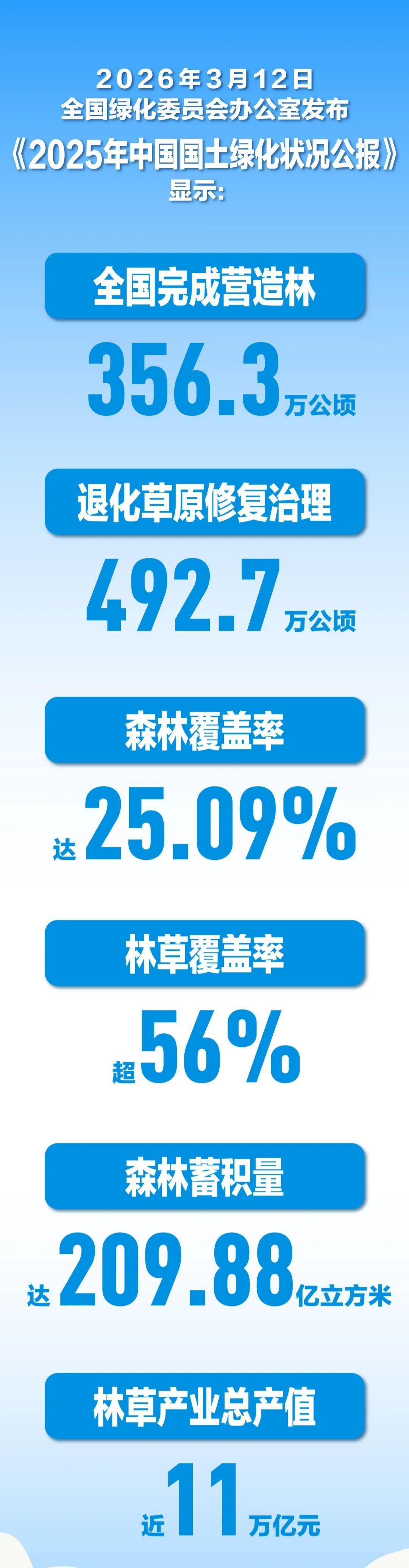 营造林356.3万公顷; 退化草原修复492.7万公顷; 森林覆盖率25.09%; 林草覆盖率超56%; 林草产业总产值近11万亿元。