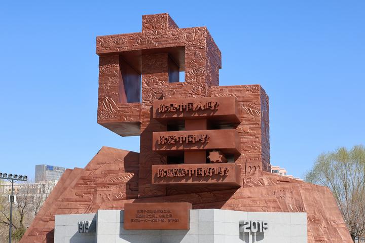 爱国三问碑的碑身以紫铜铸造,高10米,雕塑主体为中国二字,顶天立地、庄严肃穆。国字正中突出爱国三问主题字样,格外醒目。雕塑表面融入山水云纹及长城、泰山、牡丹等中华传统文化符号,基座四角设有荷花浮雕,寓意南开人的君子品格,基座台阶以南开系列学校的标志性八角校徽为造型,向心而收,层层汇聚到雕塑主体,寓意南开人公能日新、爱国奋斗的不变初心。